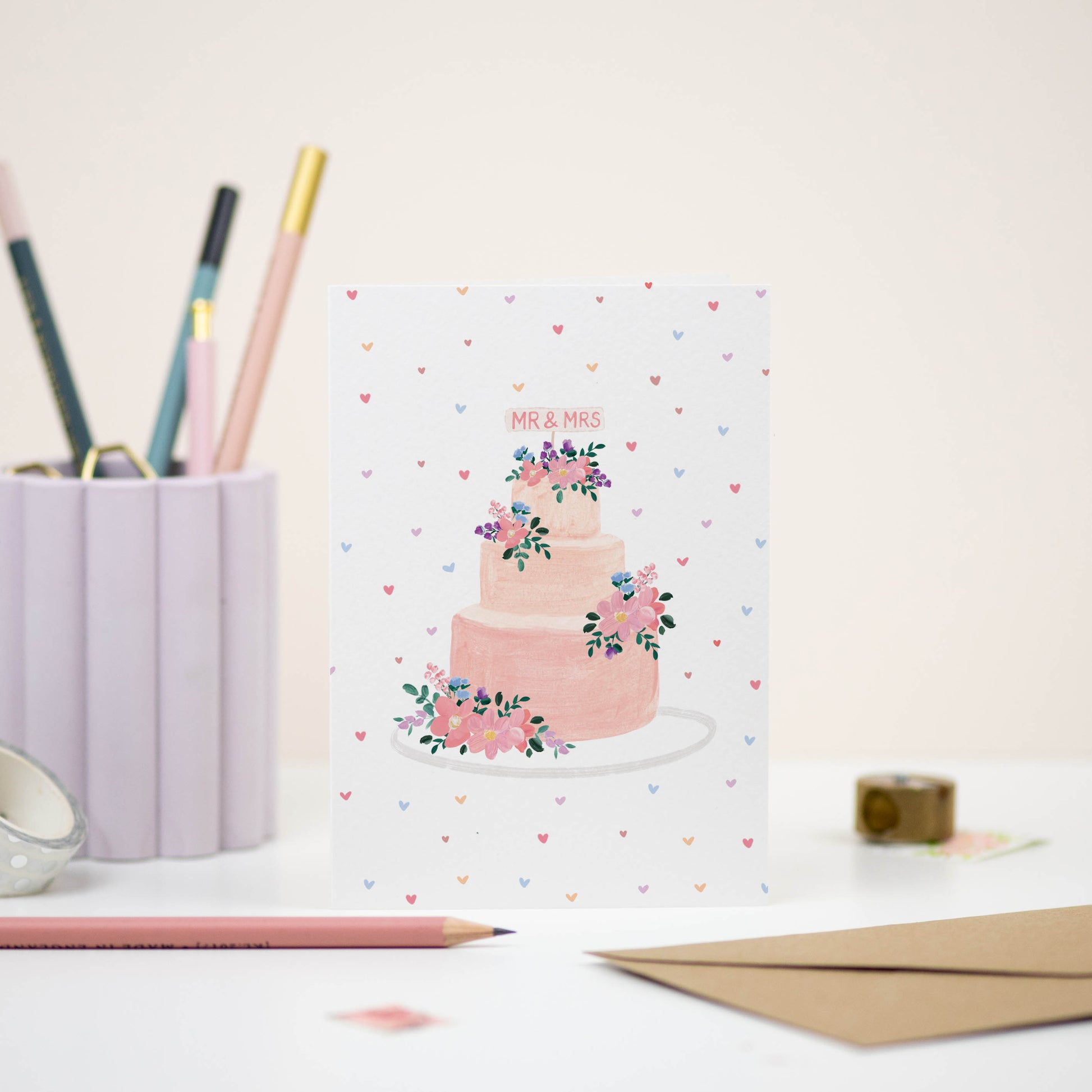 Congratulate the newly weds on their wedding day with this lovely wedding cake card.