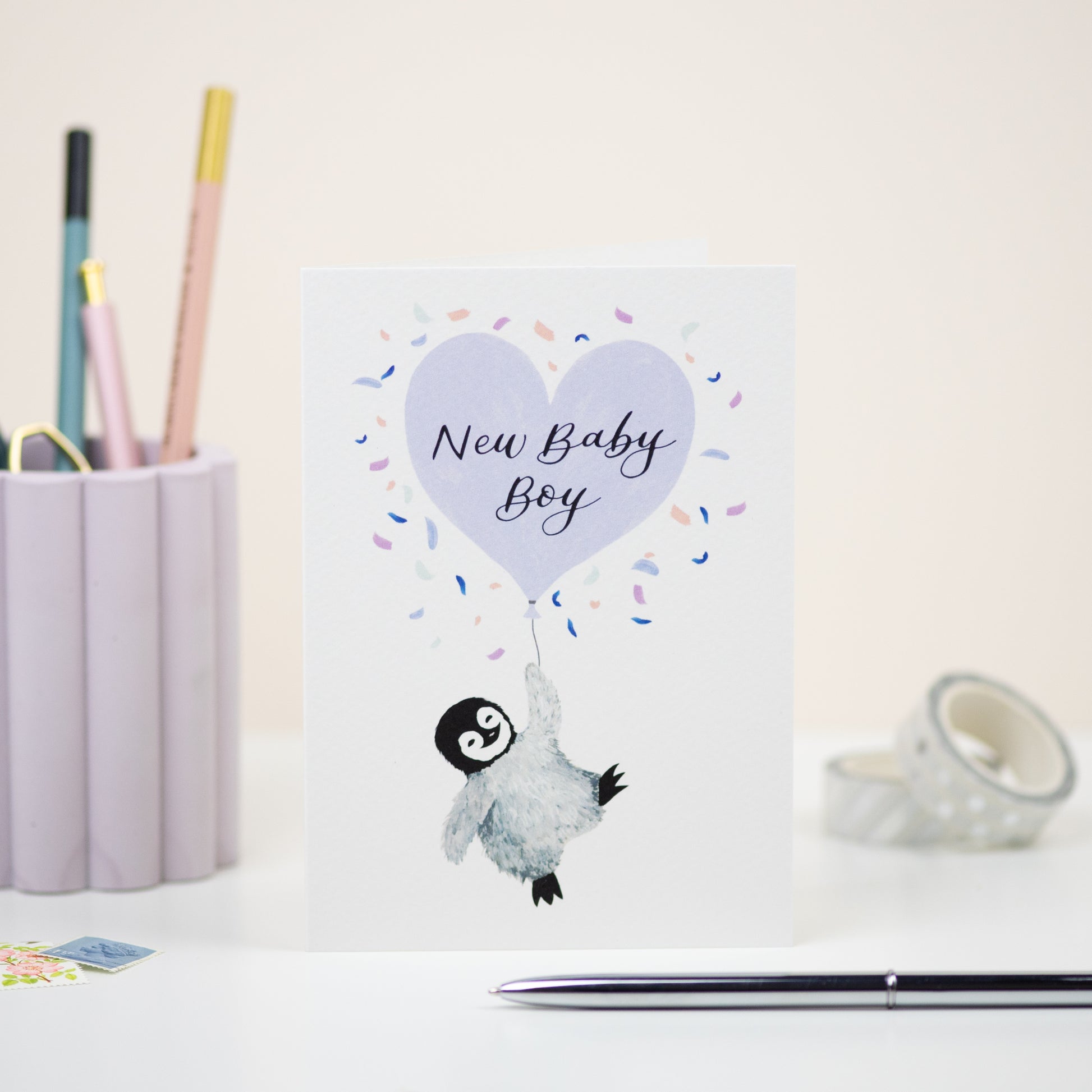 Celebrate the arrival of a new baby boy with this cute penguin card.