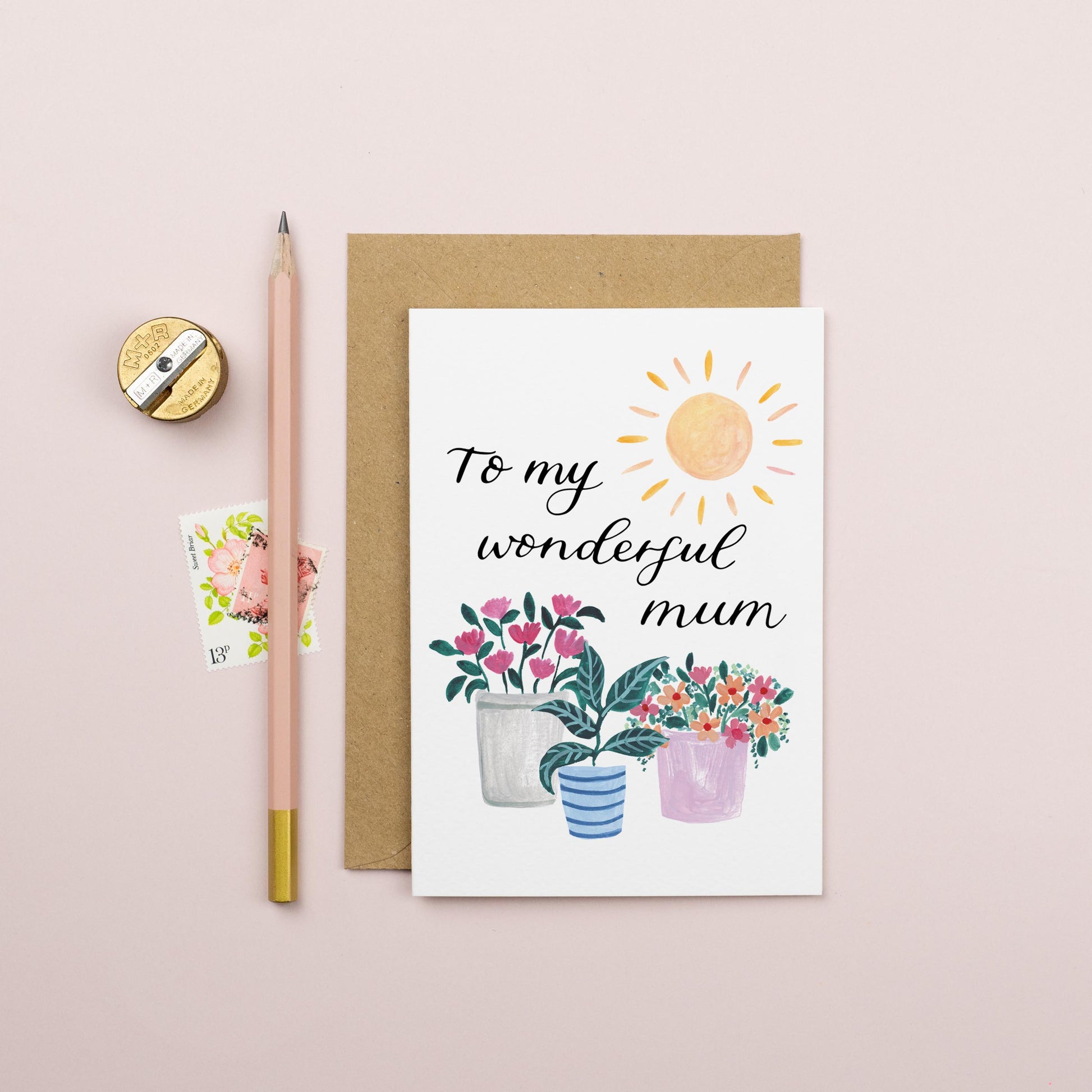 Pots of floral goodness and sunshine to wish your mum a Happy Mother's Day. The lettering says 'To My Wonderful Mum'.